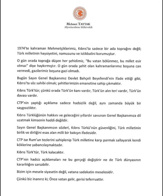 MHP Afyonkarahisar Milletvekili Mehmet Taytak, Kıbrıs Türk Federe Devleti kurucu partilerinden CTP'nin MHP Genel Başkanı Devlet Bahçeli'ye yönelik açıklamalarına sert bir yanıt verdi. Taytak, yayımladığı yazılı basın açıklamasıyla haddini aştığını belirttiği CTP'yi eleştirdi.