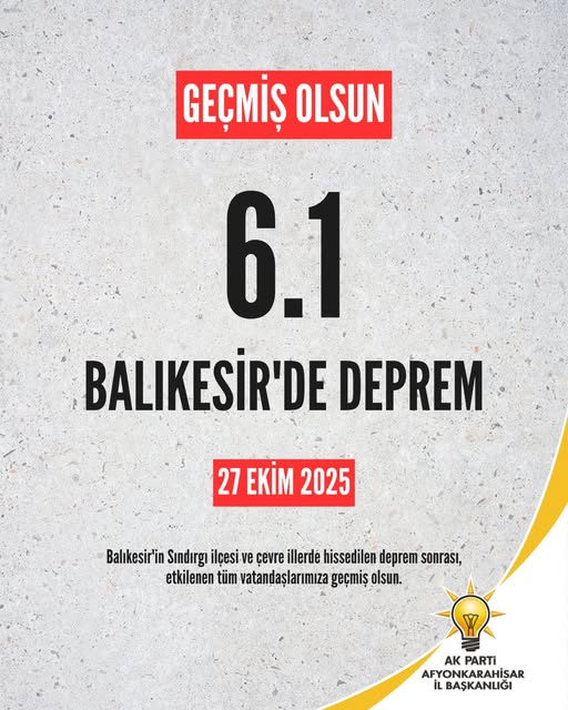 AK Parti Afyonkarahisar İl Başkanlığı, Balıkesir'in Sındırgı ilçesi merkezli meydana gelen deprem nedeniyle bir başsağlığı ve geçmiş olsun mesajı yayımladı.