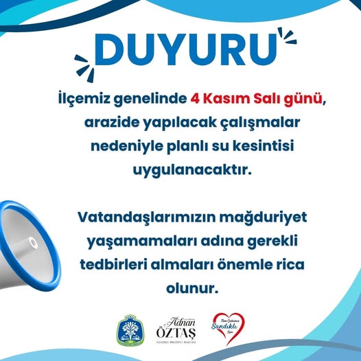 Su kesintisi, arazide yapılacak çalışma nedeniyle yapılacak. Belediye, hemşehrilerini mağduriyet yaşamamaları için gerekli tedbirleri almaları konusunda uyardı.